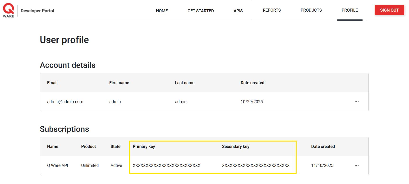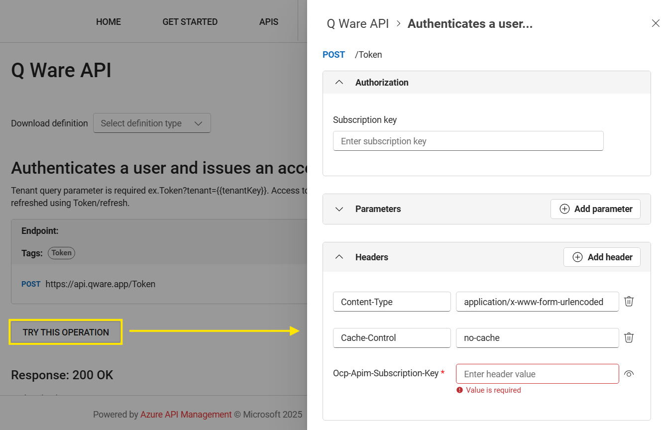 The Q Ware API acts as it's own authorization server, meaning it manages it's own token issuance and permissions. All requests to the API must contain an Authorization header with a valid bearer token as well as a header for "Ocp-Apim-Subscription-Key" with a valid subscription key.